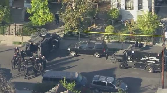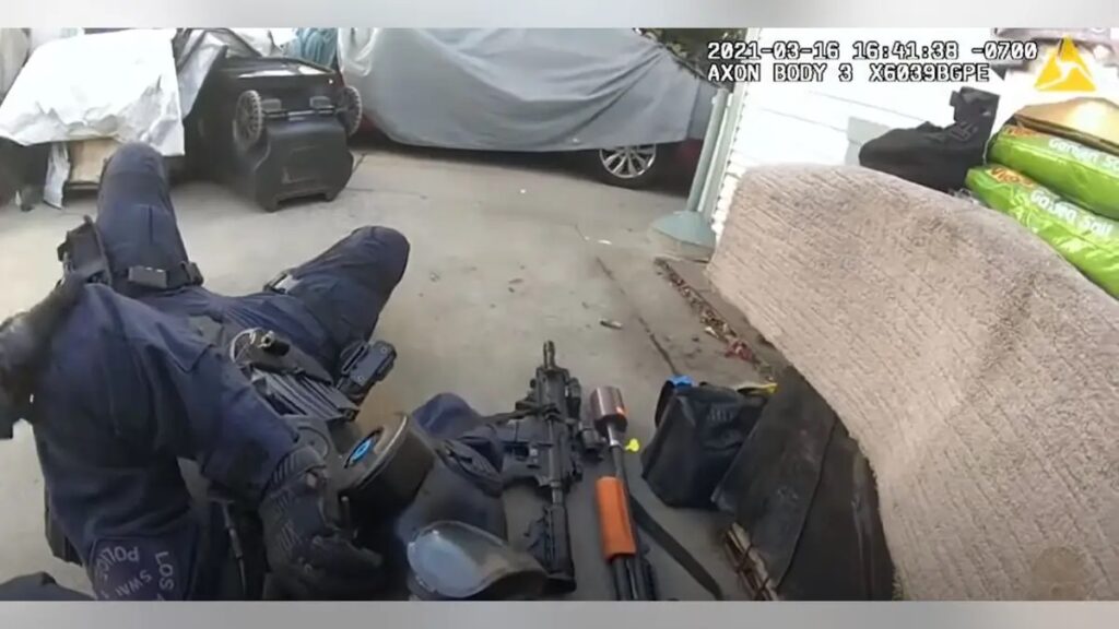 Police body camera footage released Monday by the Los Angeles Police Department shows an hours-long standoff earlier this month in which a SWAT officer was shot near the face and a suspected gunman was killed.