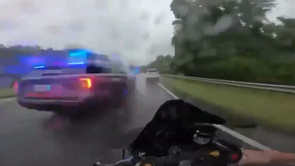 Running from the police is a no-no under any circumstances. Doing so while riding on a motorcycle , in torrential rain, and without basic safety gear only makes things worse, and turns a bad decision into a disastrous one.