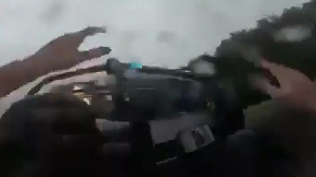 As a result, he slams on the tarmac and, for several seconds, slides on his back down the road. Moments later, one of the police officers steers directly into his path, forcefully knocking him down.