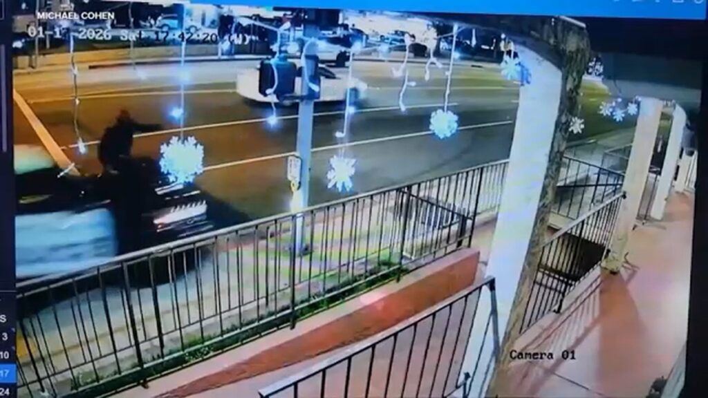 MONTEBELLO, Calif. (KABC) — New video captured the moment a Montebello police vehicle hit a person crossing the street, leaving him in critical condition.