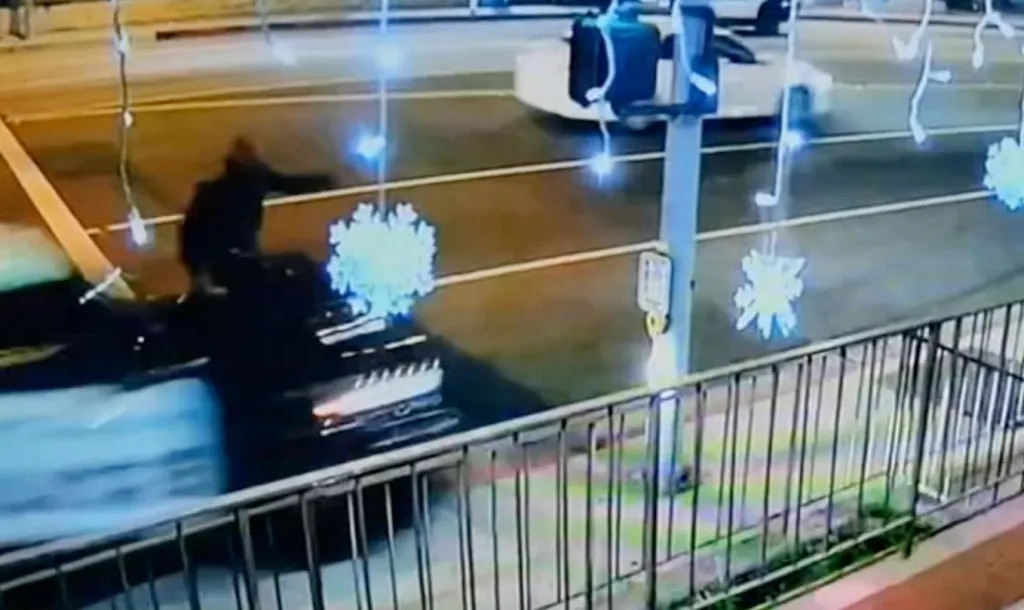 Surveillance footage shows the man crossing the street in a marked crosswalk, just steps away from reaching the sidewalk, when the police car in the right lane struck him. Moments later, the officer runs out of the car and toward the man, who landed yards away.