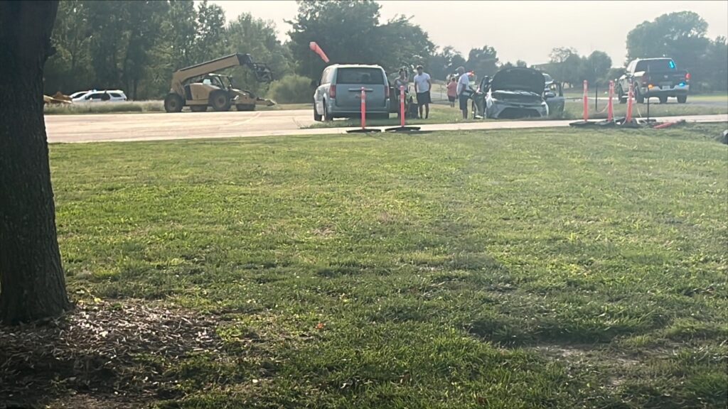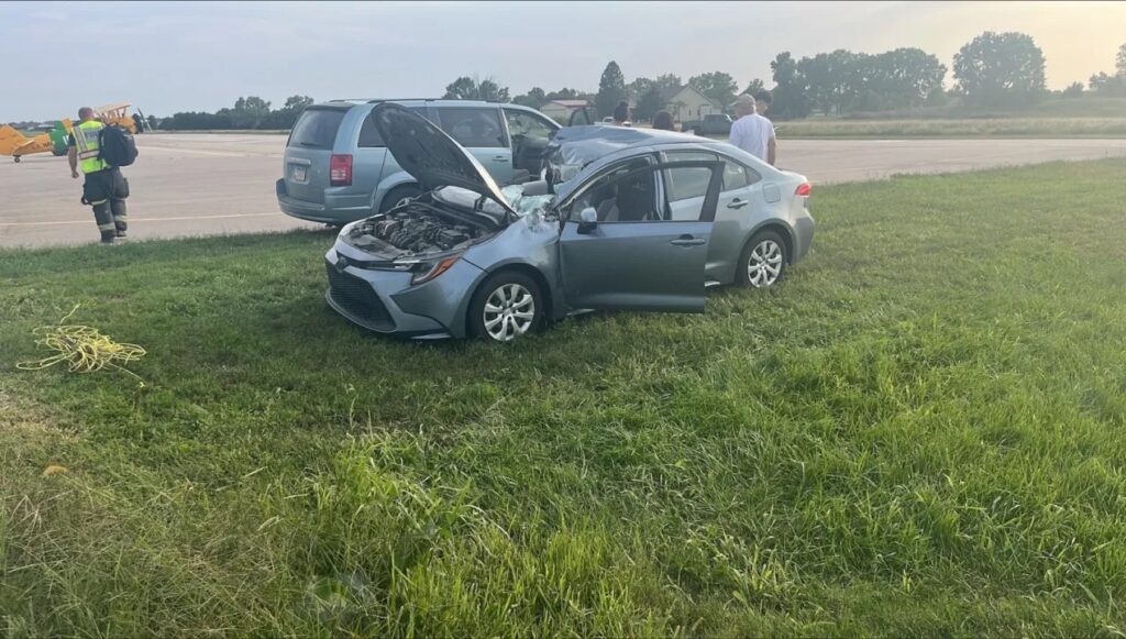 The Kansas Highway Patrol said a Toyota driven by 71-year-old Rebeca Rodriguez of Benton was eastbound on Southwest 30th Street, and a 1943 Boeing E75 Stearman was on a short approach to the south-facing runway. The aircraft’s gear struck the car, causing it to impact the ground and flip over onto its top wing.