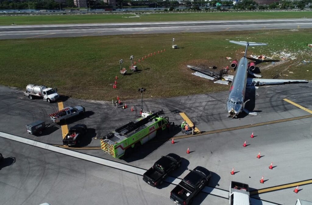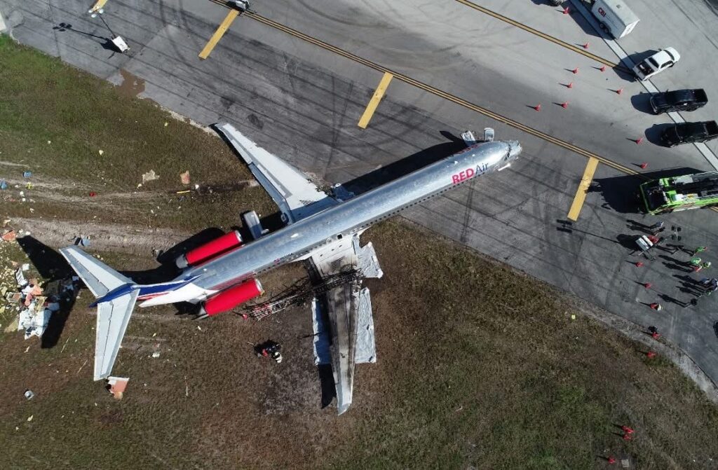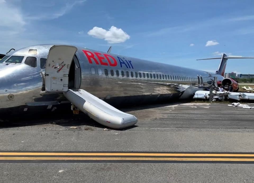 On June 21, 2022, about 1738 eastern daylight time, RED Air flight 203, a Boeing MD-82, HI 1064, overran the end of runway 9 at Miami International Airport (MIA), Miami, Florida, after the left main landing gear (MLG) failed shortly after landing. The airplane impacted a concrete and steel structure in the grassy area to the left of the runway and came a stop shortly afterward. A postcrash fire ensued while the airplane was being evacuated. Of the 140 occupants aboard the airplane, 4 passengers sustained minor injuries. The postcrash fire was subsequently extinguished by aircraft rescue and firefighting (ARFF) personnel from Miami-Dade Fire Rescue. The airplane was operating under Title 14 Code of Federal Regulations Part 129 as a scheduled international passenger flight from Las Américas International Airport (SDQ), Santo Domingo, Dominican Republic, to MIA.
