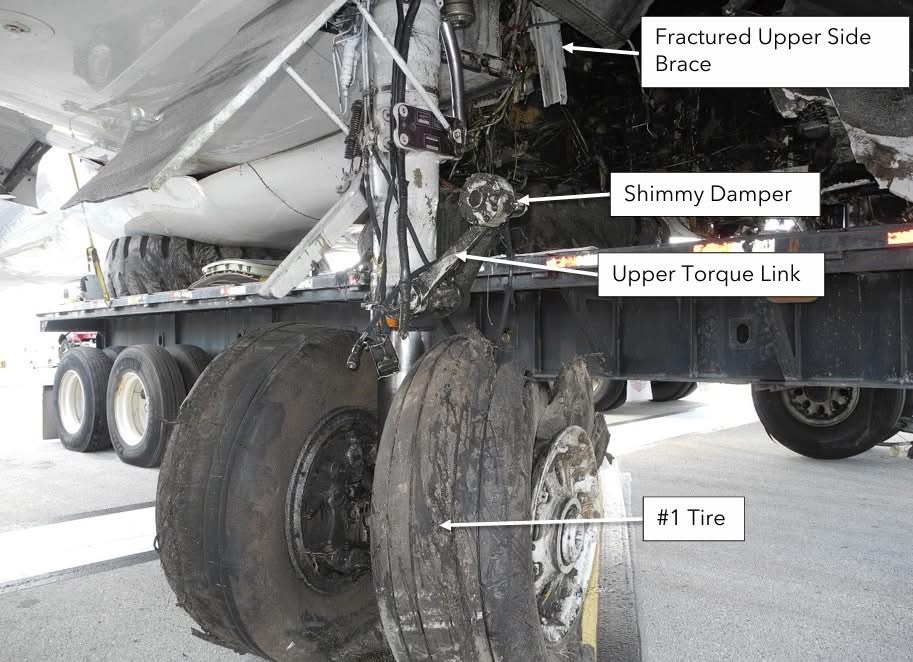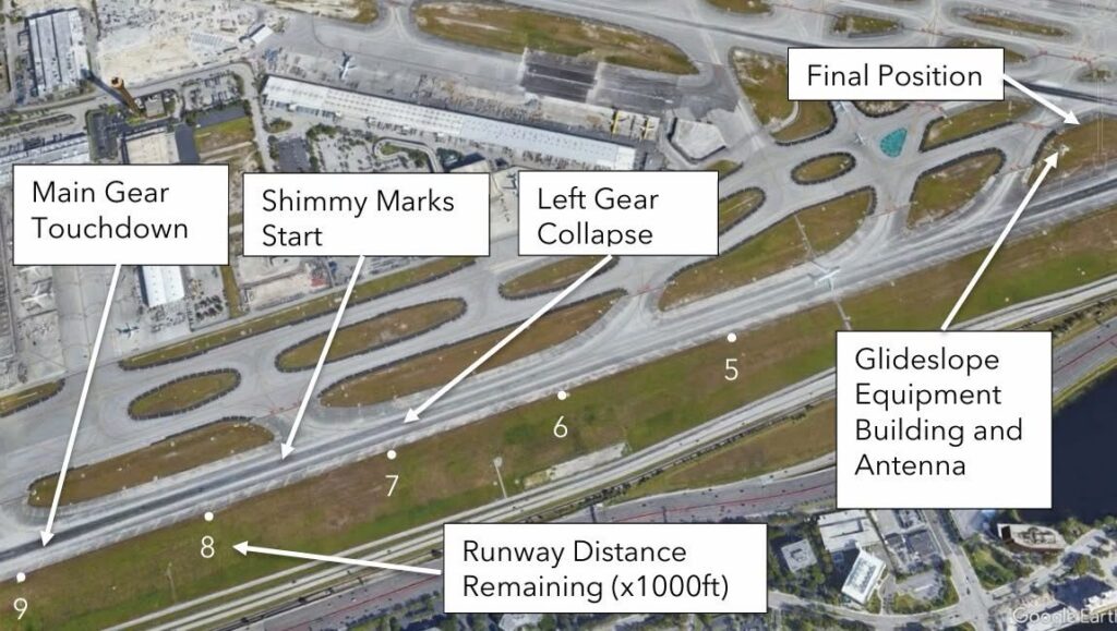 Video evidence (from an airport camera and a passenger’s cell phone) showed that the airplane touched down on runway 9 with about 8,900 ft remaining. Tire deposits on the runway, which started about 1,300 ft from the touchdown point, showed evidence of left MLG shimmy, which is a torsional vibration mode of the landing gear in which the inner cylinder oscillates relative to the outer cylinder. The amplitude of the shimmy increased steadily until the left MLG collapsed under the airplane with about 6,930 ft remaining on the runway. The airplane skidded on its left wing down the runway, veered to the left, and the right wing impacted a glideslope equipment building and antenna. The airplane’s nose gear and right MLG collapsed, and the airplane came to a stop. Figure 3 shows pertinent events during the accident landing.