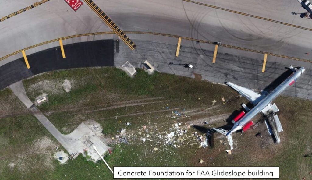 The first officer recalled that the airplane touched down smoothly on the right and then the left MLG and that the airplane was slightly to the right of the centerline, which he corrected after touching down. Shortly afterward, the flight crew felt a vibration on the left side of the airplane. The vibration increased, and the airplane veered to the left despite the crew’s efforts to maintain the airplane on the runway centerline. The airplane subsequently departed the paved runway surface and impacted the glideslope equipment building for runway 30, which was located to the left of runway 9, causing the nose landing gear and the right MLG to collapse. A postcrash fire began on the right wing after the fuel tank on that wing was breached, after which the airplane came to a stop.
