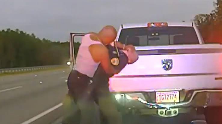 Cure grabbed the deputy by the roadside as highway traffic sped past them. Both men can be seen grappling with arms around each others’ necks. Cure got a hand on the deputy’s lower face and neck and began forcing his head backward. The deputy struck Cure in the side with a baton, but Cure maintained his grip.