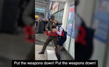 Wild video shows a hero former boxer bravely swapping places with a woman being held hostage at knifepoint at an airport — then fighting back and swiping the crazed kidnapper’s …